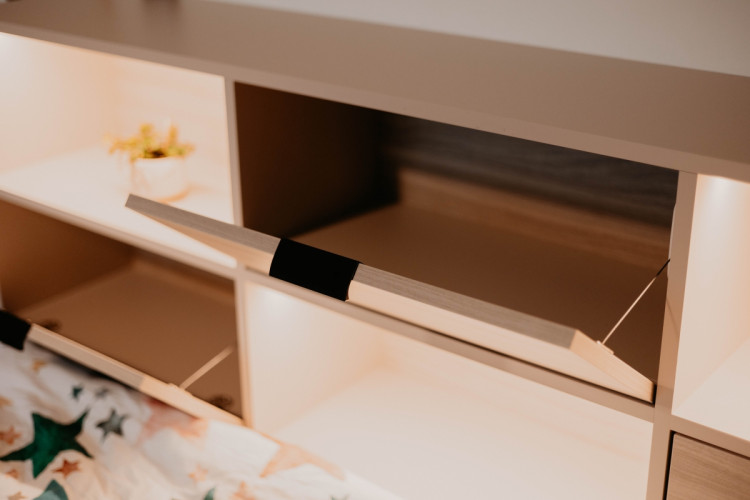 Maar dat is nog niet alles. Het jeugdbed is ook voorzien van geïntegreerde ledverlichting in de open vakken, waardoor de ruimte niet alleen functioneel, maar ook sfeervol verlicht wordt.