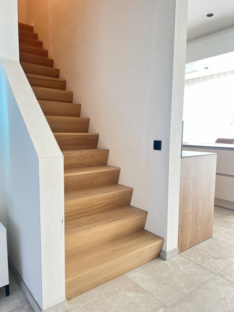 Of je nu op zoek bent naar een open of gesloten (met tegentreden) trap, wij hebben de expertise en ervaring om aan al jouw behoeften te voldoen. Onze trappen kunnen worden aangepast aan elke ruimte, met opties zoals een kwartdraai, aansluitende palier, en zelfs de keuze om de trap af te werken aan de onderzijde voor een naadloze integratie in jouw interieur.